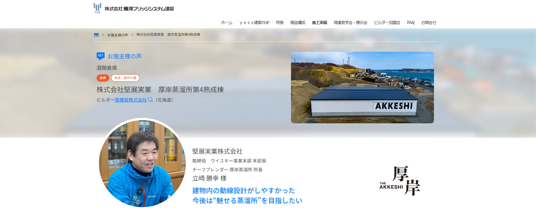 今回のお施主様は、厚岸ウイスキーを手掛ける堅展実業株式会社様です。ウイスキーの熟成棟や充填棟、精麦棟など計5棟でyess建築を採用いただいています。是非ご覧ください。