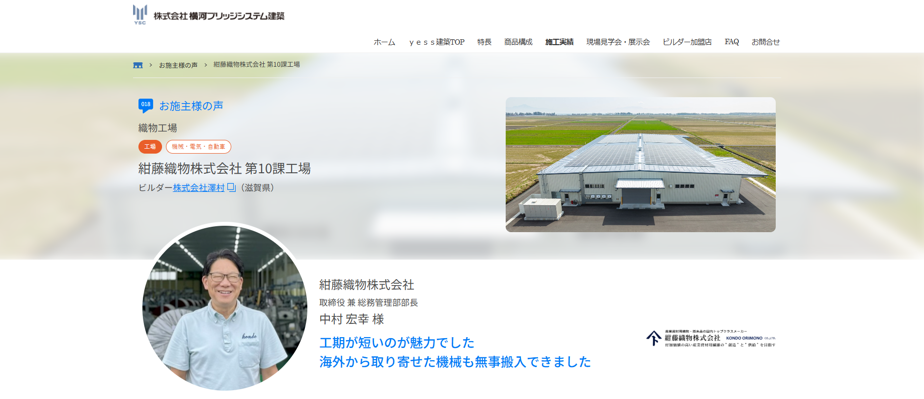 今回のお施主様は、滋賀県高島市に本社を置く産業資材用織物・撚糸の老舗メーカー、紺藤織物株式会社様です。これまでたくさんの建物を建てられた中で感じたyess建築のメリットをお話いただきました。是非ご覧ください。