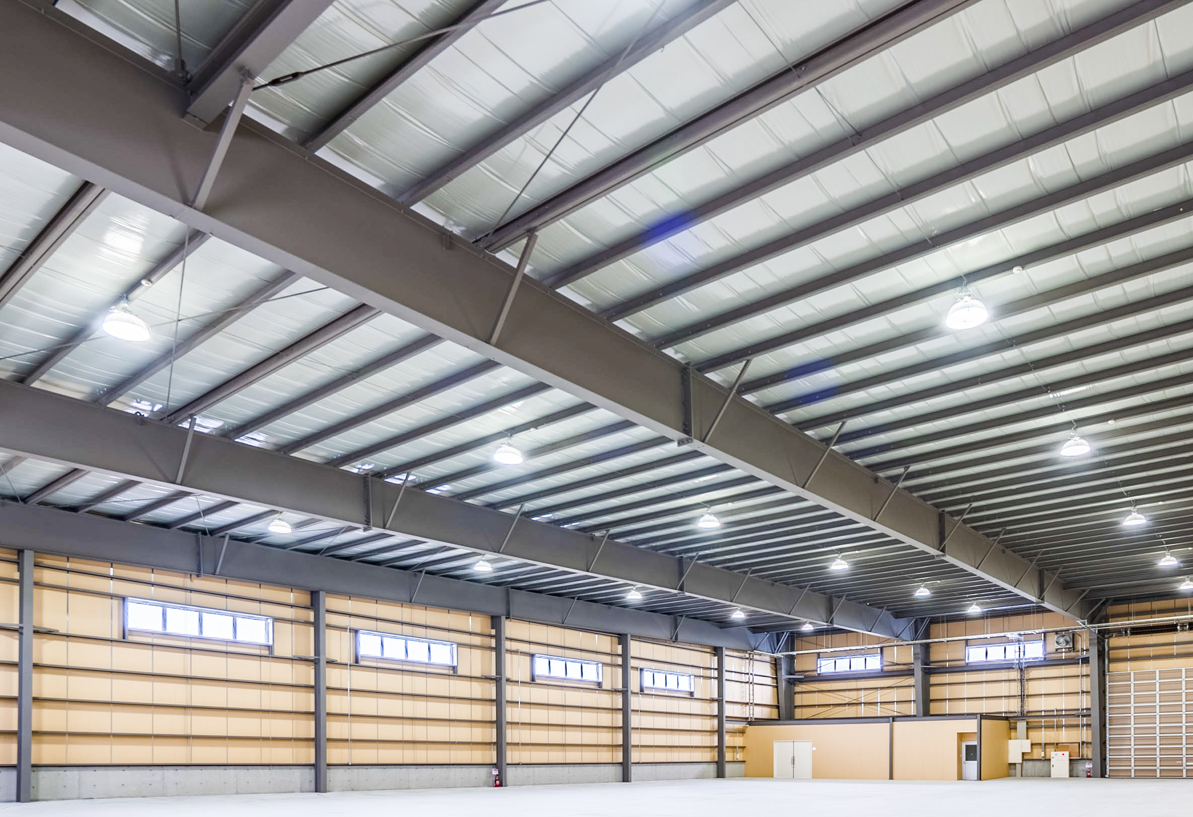主柱間隔は横河のシステム建築でも広めの8.0mピッチで、幅5.9m x 高さ5.5m のオーバードアとマンドアが柱間にぴったり納まるサイズです。