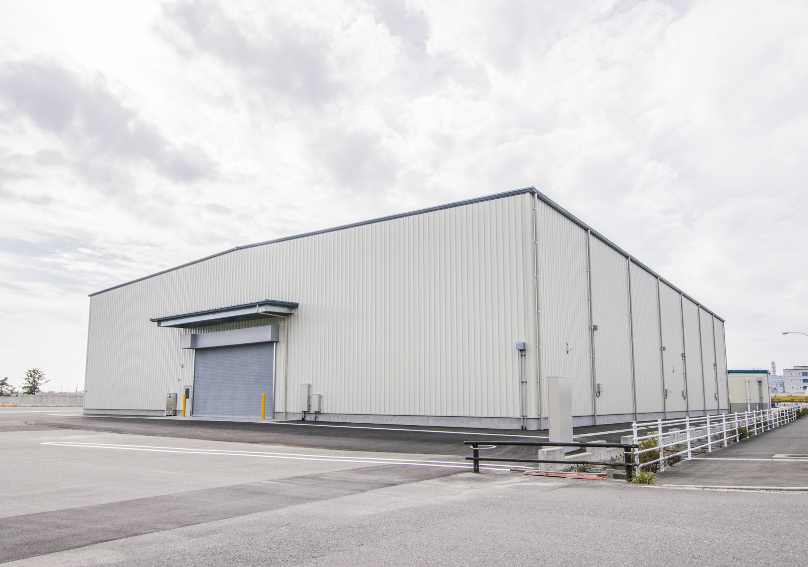 建物両側には大開口として W8.0m x H4.5m の重量電動シャッターとシャッター内側にはシートシャッターが設置されています。