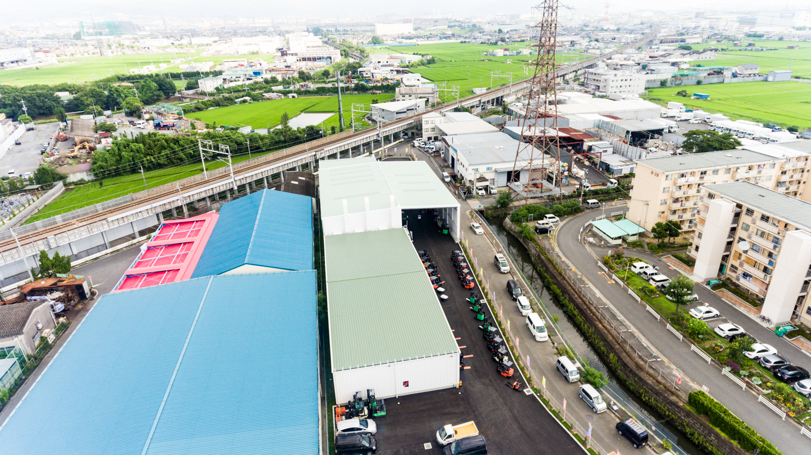 中央手前のグリーン色の屋根の建物が今回建設いただきました車両倉庫棟です。