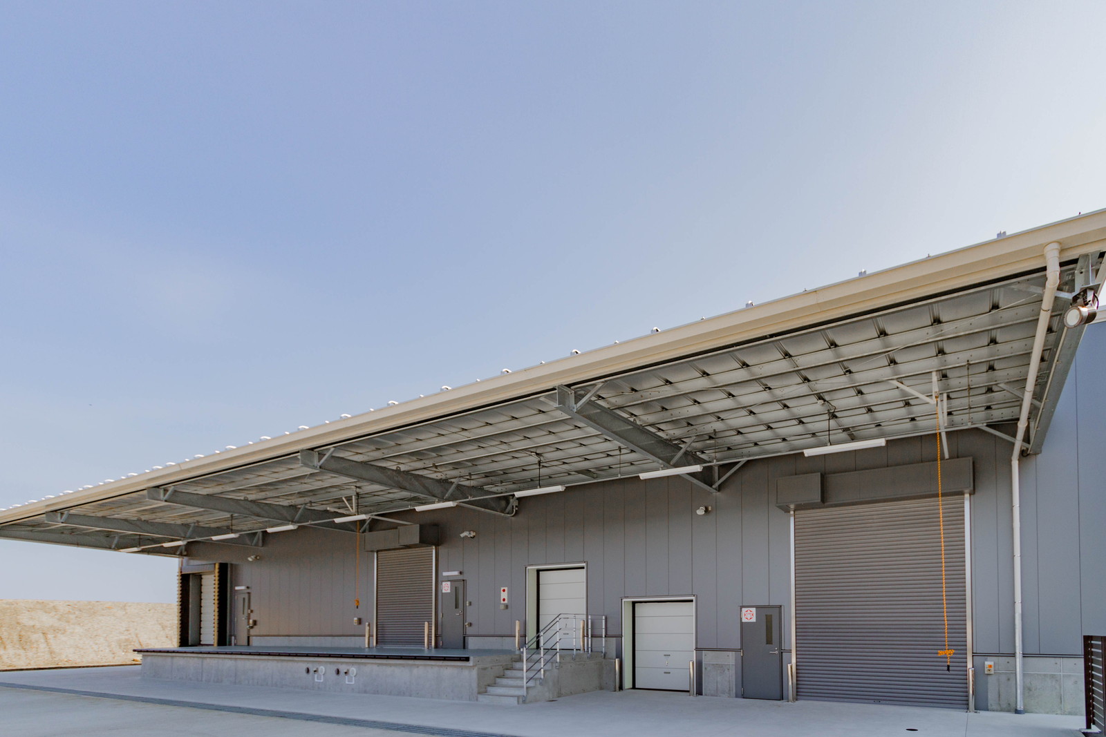 工場エリア側には出寸法5.5mの大きな鉄骨現し庇を設けています。
