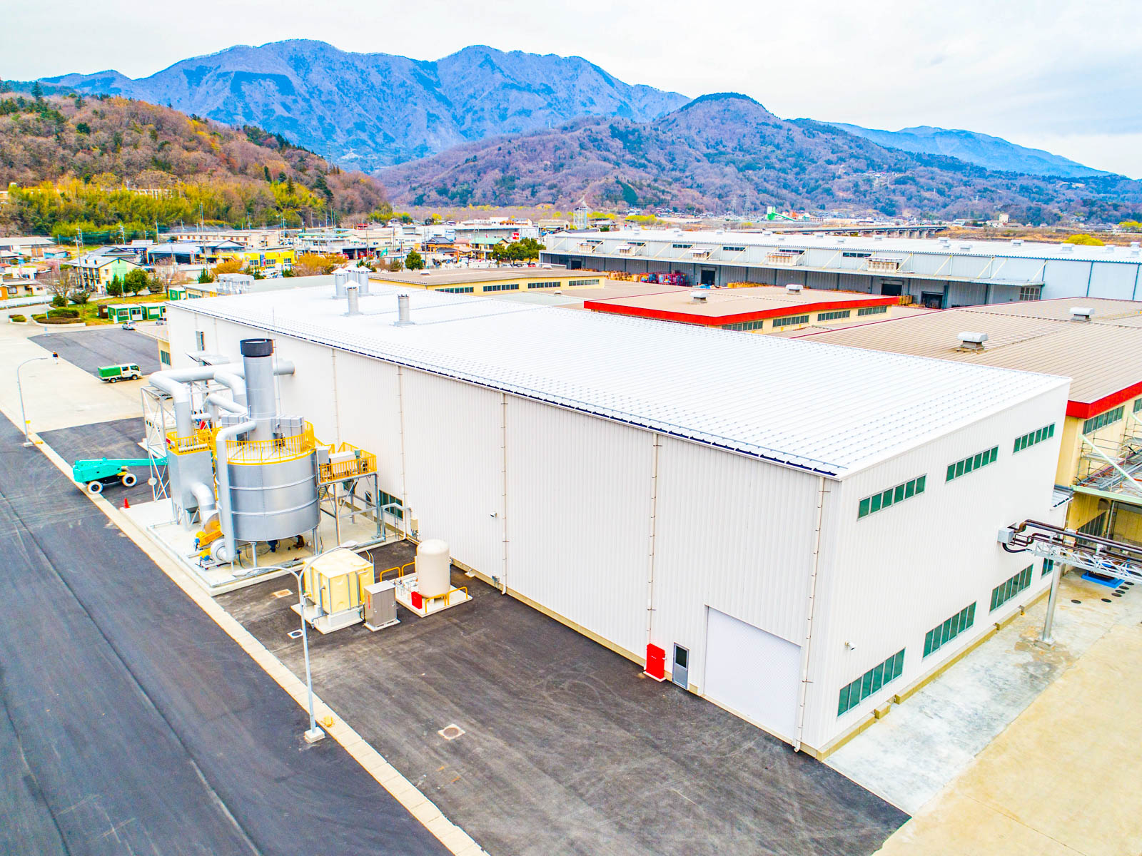 山梨県南巨摩郡身延町の山梨工場内にロールジェットドライヤー棟とバイオマスボイラー棟の2棟をシステム建築で建設いただきました。