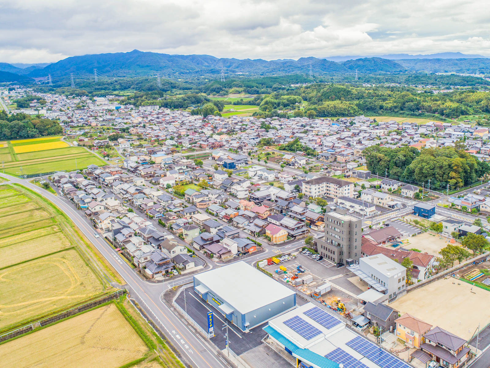 写真中央の大きな建物のある敷地が有限会社オカイチ産業 様の本社事業所で、右側建物がこのたびシステム建築で建設いただきました村井第二倉庫になります。