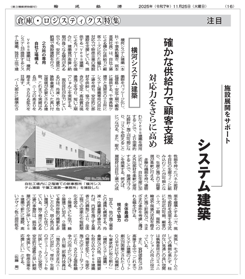専門紙「輸送経済新聞」に横河システム建築の記事が掲載されました