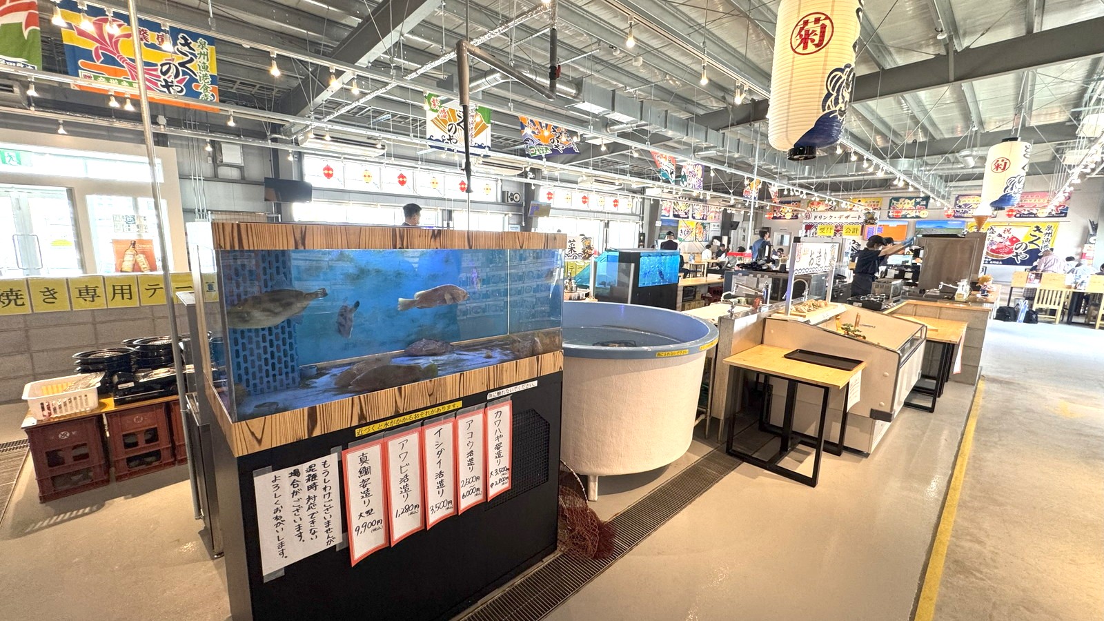大漁旗に囲まれ活気ある店内にはいけすがあり、のびのびと魚が泳ぎます。テーマパークのような雰囲気すらあるこちらの店舗も「yess建築」が採用されています。